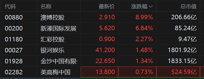 澳博控股大涨9%领衔,且录得6连涨行情,新濠国际发展涨约7%,银河娱乐、金沙中国、美高梅中国皆上涨。消息上,澳门复活及清明假期105.1万旅客人次到访。里昂发表报告指,澳门今年博彩业继续发展,访客量和赌收表现良好,美高梅中国和永利澳门亦恢复派息。该行将澳门今年赌收预测上调4%至303亿美元,并维持明年赌收319亿美元的预测。另外,此前公布的3月份幸运博彩毛收入195.03亿澳门元,同比增长53.1%。