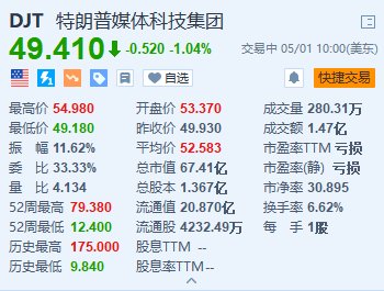 特朗普媒体科技集团(DJT.US)回吐盘初近9%涨幅,现跌超1%,报49.41美元。消息面上,根据美国证券交易委员会的文件,截至4月26日,特朗普持有的特朗普媒体科技集团(TMTG)股份从3月25日的57.6%增至64.9%。TMTG是特朗普的社交媒体平台Truth Social的母公司,根据股票最后收盘价计算,特朗普持有的TMTG股份价值57.3亿美元。