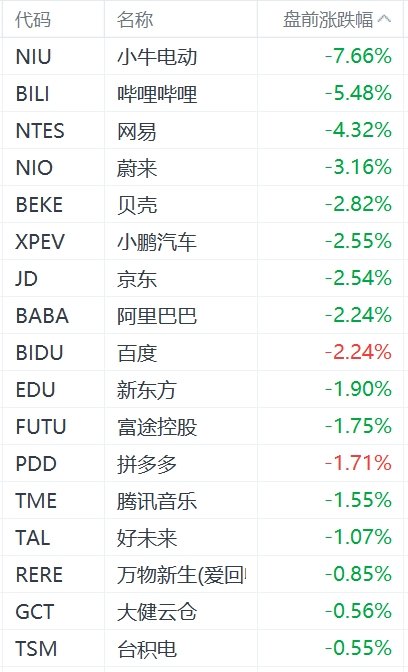 港股科技股今日集体下跌,恒生科技指数收跌2.13%,拖累美股热门中概股盘前集体下跌。其中,小牛电动跌超7%,哔哩哔哩跌超5%,网易跌超4%,蔚来跌超3%,贝壳、小鹏汽车、京东、阿里巴巴、百度跌超2%,新东方、富途、拼多多、腾讯音乐、好未来跌超1%。