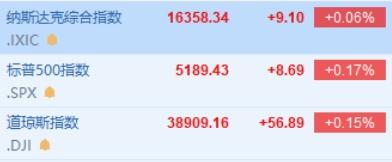美股三大指数小幅高开,纳指涨0.06%,标普500指数涨0.17%,道指涨0.15%。