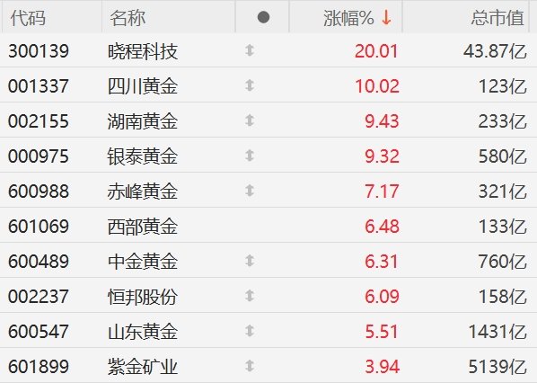 A股黄金股午后持续上涨,四川黄金涨停,湖南黄金、银泰黄金逼近涨停,晓程科技此前已涨停,赤峰黄金涨超7%,西部黄金、中金黄金、恒邦股份涨超6%,山东黄金涨超5%,紫金矿业涨近4%。金价继续走高,伦敦金现午后再度拉升涨1.32%至2446.27美元,再创历史新高。