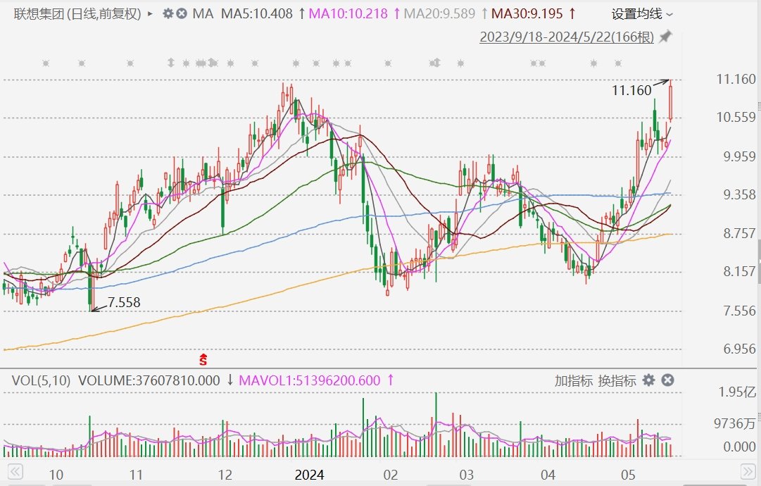 联想集团(0992.HK)盘初拉升涨超9%至11.16港元,股价创历史新高。