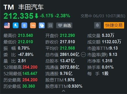 丰田汽车(TM.US)美股跌2.38%,报212.33美元。消息上,日本暂停了六款汽车的交付和销售,其中包括丰田汽车旗下三款汽车,加剧了已经牵连到几家世界顶级汽车制造商的安全丑闻。另外,本田汽车被发现伪造了与噪音和汽油发动机输出有关的数据,影响到超过300万辆汽车。
