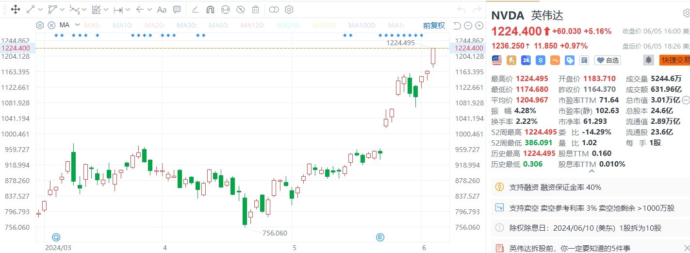英伟达(NVDA.US)收涨5.16%,报1224.4美元,连续第三个交易日创收盘历史新高,总市值突破3万亿美元,超越苹果公司,成为全球市值第二高的公司,仅次于微软。英伟达早已是全球市值最大的半导体公司,现在又成为史上首家市值达到3万亿美元的计算机芯片公司,同时市值还超越了苹果。一年多来,英伟达的盈利和股价一直在超预期。周日,该公司宣布了有关新芯片的计划以保持竞争优势。周一,美国银行分析师再次上调该股目标价,达到全华尔街最高1500美元(较周三收盘高22.5%),表示英伟达的增长前景证明其溢价合理。