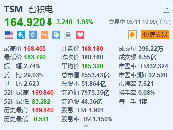 台积电(TSM.US)跌超1.9%,报164.92美元;该股昨日收涨2.29%,股价创历史新高,年内累涨超60%。消息面上,高盛集团大宗经纪部门的数据显示,基金经理已连续第三周净卖出美国科技股。其中,半导体和半导体设备类股在截至6月7日的当周名义上净卖出最多,而软件类股则净买入最多。