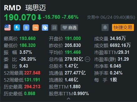 瑞思迈(RMD.US)现跌7.66%报190美元。消息上,因为礼来公司表示其减肥药物降低了睡眠呼吸暂停症的严重程度,而这正是瑞思迈所服务的市场之一。礼来公司表示,他们正在寻求美国食品和药物管理局批准将减肥药物Zepbound的使用范围扩展到包括睡眠呼吸暂停症。这家药品巨头表示,他们进行的试验发现Zepbound降低了睡眠呼吸暂停症的严重程度。