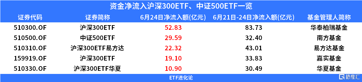 6月21日到25日,两个交易日,华泰柏瑞沪深300ETF净流入资金达83.73亿,沪深300ETF易方达资金净流入额达43.01亿,嘉实基金沪深300ETF资金净流入金额为33.83亿,南方中证500ETF净流入资金达32.40亿,沪深300ETF华夏资金净流入额达30.49亿。4只沪深300ETF和1只中证500ETF两日“吸金”超223亿。