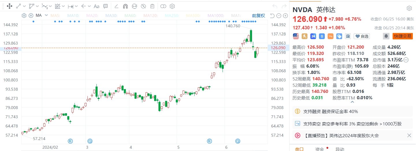 英伟达(NVDA.US)在遭遇4300亿美元的抛售后,结束了连续三个交易日的暴跌,周二收涨6.76%报126.09美元,总市值重回3万亿美元。瑞银表示,英伟达近期的抛售并不反映技术或整体市场的前景恶化,因为其他需求信号是积极的。Neuberger Berman Group的史蒂夫·艾斯曼认为,这家芯片制造商的三天暴跌只不过是“昙花一现”。他周二在接受采访时表示,他持有该芯片制造商的“大量”股份,并认为这是一项长期投资,对未来几年都具有重要意义。