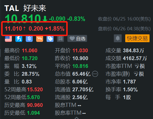 好未来(TAL.US)美股盘前涨1.85%报11.01美元。中国银河证券最新研报指,消费信心渐近复苏,重点配置兼具情绪及社交价值的旅游教育板块。核心布局K12教培、民办学历教育两条主线。建议关注新东方、好未来等。另外,该股此前公布的Q4净营收超预期,调整后每ADS收益扭亏为盈。
