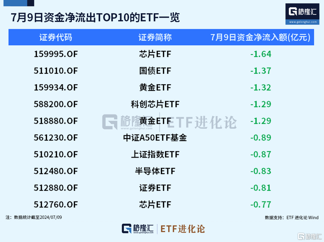 7月9日,芯片ETF净流出额最多,为1.64亿元;国债ETF净流出额为1.37亿元;黄金ETF净流出额为1.32亿元。