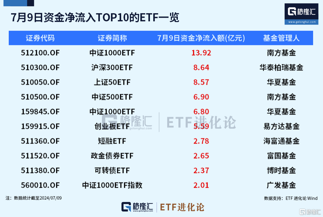 ETF资金流入方面,在7月9日的非货币ETF中,中小盘股相关ETF与债券ETF净流入额靠前。2只规模较大的中证1000ETF合计净流入超20亿元;3只债券ETF进入前十。