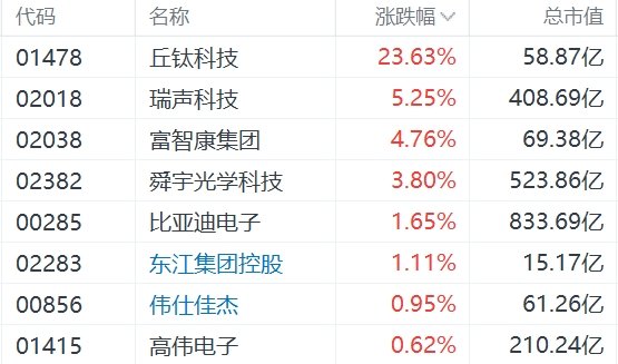 有消息称苹果公司计划提高新款iPhone手机的出货量目标,增幅超过一成,香港市场苹果概念股集体走强。其中,丘钛科技涨超23%,瑞声科技涨超5%,富智康集团涨近5%,舜宇涨近4%,比亚迪电子和东江集团涨超1%。据悉,苹果今年下半年至少将付运9000万部新款iPhone 16,较前一代iPhone 15去年下半年的出货量约8100万部、增长约11.1%。