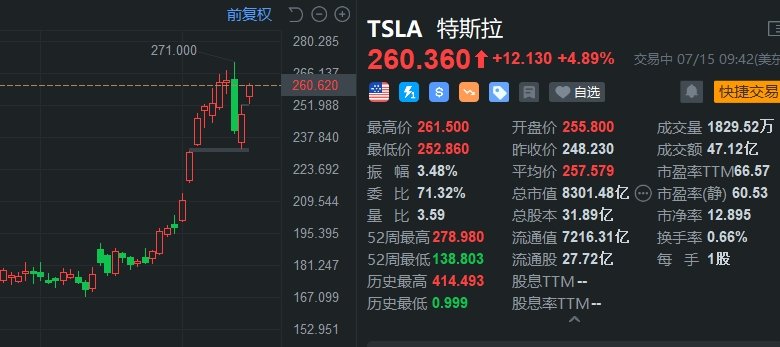 特斯拉(TSLA.US)涨幅扩大至近5%,报260.5美元。消息上,特朗普遭枪击后不久,马斯克在社交媒体平台X发声正式支持特朗普。马斯克表示,“我完全支持特朗普并希望他早日康复。”此前几个月,人们一直在猜测马斯克是否会支持他。日前有报道称马斯克向一个致力于帮助特朗普入主白宫的超级政治行动委员会捐款。