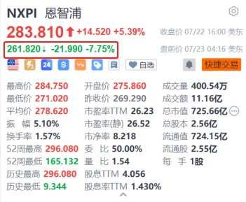 恩智浦(NXPI.US)美股盘前跌7.75%,报261.82美元。消息面上,恩智浦第二季度营收31.3亿美元,同比下降5.2%,市场预期34亿美元;每股盈利2.54美元,市场预期2.52美元,上年同期为2.67美元。期内最大收入源汽车业务收入17.28亿美元,同比下降7.4%,降幅远超一季度的1.3%,体现了汽车行业疲软的形势。恩智浦预计,第三季度non-GAAP营收在31.5亿至33.5亿美元之间,而分析师预期位于指引区间的高端33.5亿美元;预计每股盈利在2.6至3.01美元之间,同比持平或下降13.6%,低于分析师预期的3.09美元。