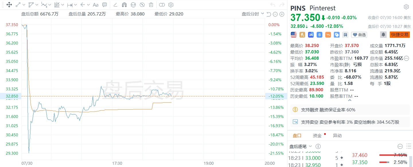 Pinterest美股盘后一度暴跌逾21%。Pinterest二季度调整后EPS为0.29美元,分析师预期0.28美元。二季度收入8.537亿美元,分析师预期8.482亿美元。二季度月活用户数5.22亿,分析师预期5.1804亿。二季度ARPU为1.46美元,分析师预期1.63美元。二季度调整后EBITDA为1.799亿美元,分析师预期1.776亿美元。预计三季度营收8.85亿-9.00亿美元,分析师预期9.077亿美元。