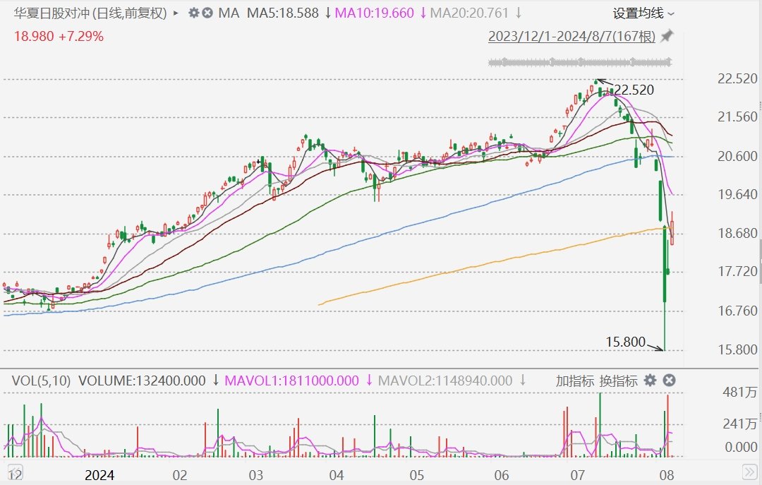 此前持续大跌的华夏日股对冲(3160.HK)今日反弹,最高涨8.65%报19.22港元。