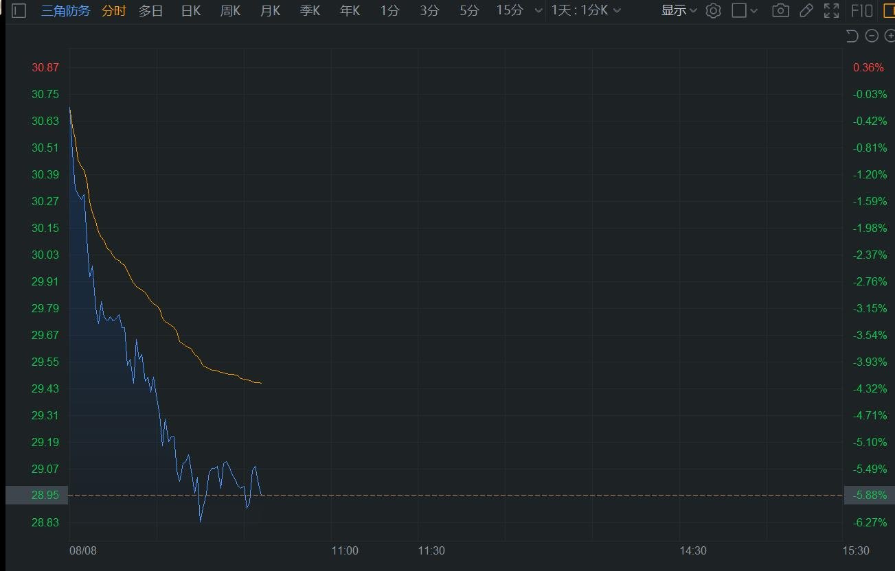 三角防务(300775.SZ)跌幅扩大至超6%,股价失守30元关口,总市值跌破160亿元。近日,公司收到副总经理严党为先生发来的《减持股份告知函》,2024年7月29日至2024年8月6日,其累计减持5.25万股。此外,该公司昨日遭北上资金减持45.72万股。