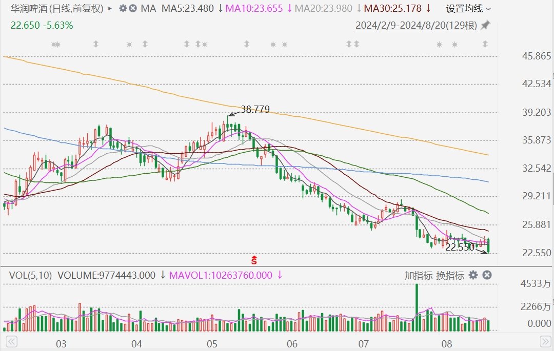 华润啤酒(0291.HK)盘中跌6%至22.55港元,股价创2017年12月以来新低。华润啤酒昨日午间公布业绩显示,2024年上半年营收237.4亿元,同比减少0.5%,符合预期;纯利47.1亿元,同比升1.2%,略逊市场预期。