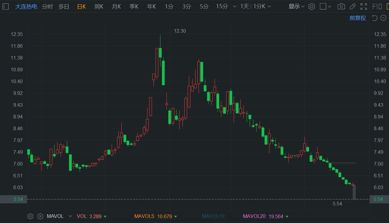大连热电(600719.SZ)一字板跌停,报5.54元创13个月新低价,市值22.4亿元。筹划1年有余,大连热电的百亿重大资产重组宣布终止,原因系“市场环境变化”。作为国内首例民营企业“分拆+重组”案例,在去年7月重组方案公布后,大连热电曾连收7个涨停板,股价在10个交易日内翻倍。此外,公司上半年净亏损4135.92万元,第二季度归母净利润-6662.11万元,同比下降125.89%。