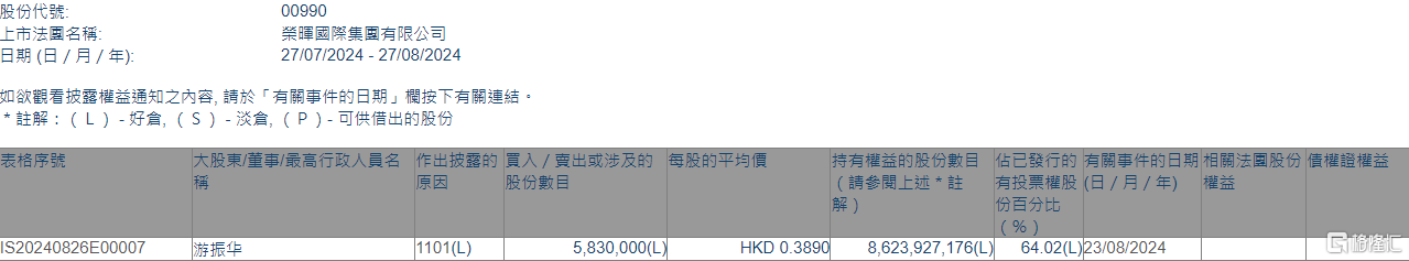格隆汇8月27日丨根据联交所最新权益披露资料显示,2024年8月23日,荣晖国际(00990.HK)获股东游振华在场内以每股均价0.389港元增持583万股,涉资约226.8万港元。