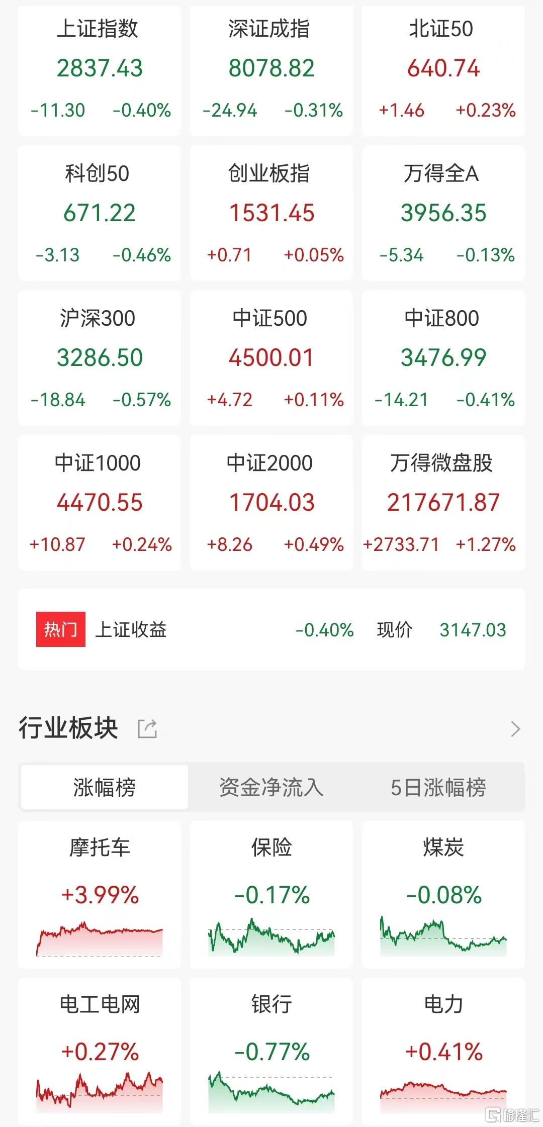 A股三大指数今日震荡走弱,盘中续创调整以来新低;截至收盘,沪指跌0.4%报2837点,深证成指跌0.31%,创业板指涨0.05%。超3400股上涨,全天成交4966亿元,较前一交易日缩量149亿元。盘面上,房屋检测板块大幅回调,深圳瑞捷、旭杰科技等多股跌超10%;汽车整车板块走低,江淮汽车跌超6%;银行板块普跌,瑞丰银行等多股跌超2%;工程咨询服务、航空机场及酿酒等板块跌幅居前。另外,五部门印发《关于完善市内免税店政策的通知》,中百集团等多股涨停;盲盒经济板块逆市走高,潮宏基涨停;教育板块拉升,中公教育涨停;小金属、化肥行业及培育钻石等板块涨幅居前。