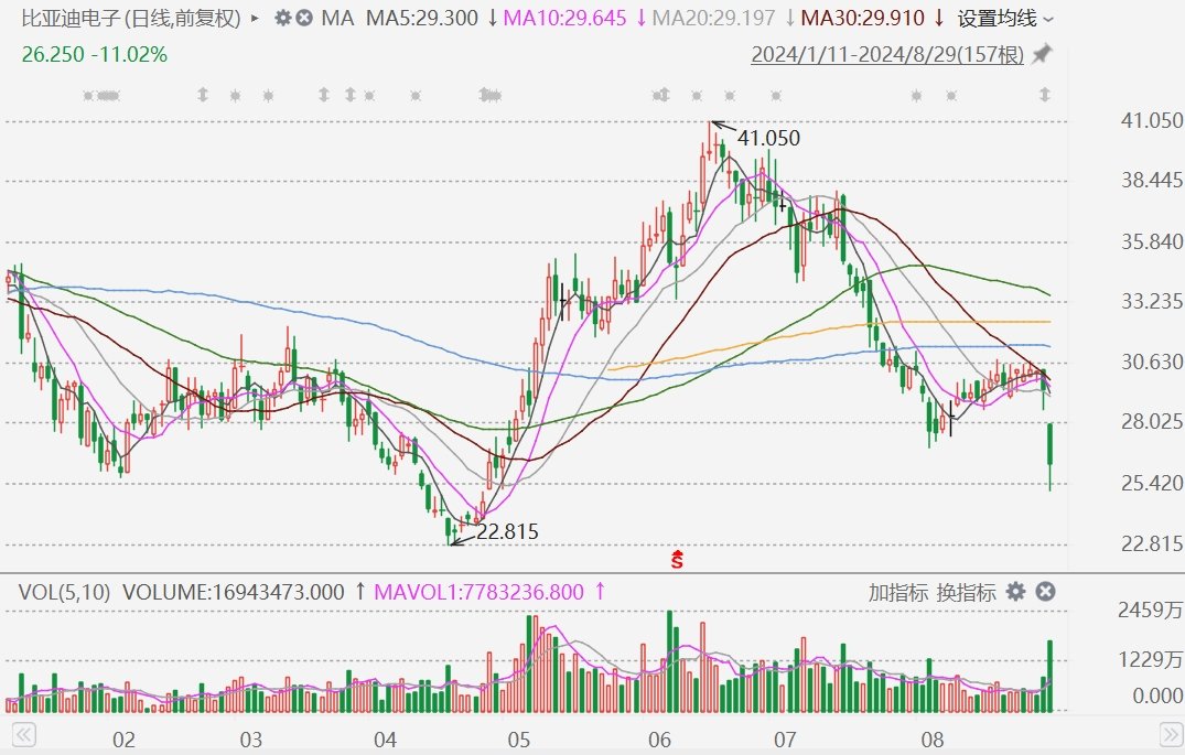 比亚迪电子(0285.HK)盘中一度大跌近15%至25.1港元,股价创4个月新低。公司昨晚公布业绩显示,截至6月底止中期纯利15.18亿元,同比升0.1%;每股盈利0.67元,不派中期息。期内收入785.81亿元,同比升39.9%;毛利53.79亿元,升22%;毛利率由去年同期约7.85%下降至期内约6.85%,毛利率下降的主要原因是销售结构变化。