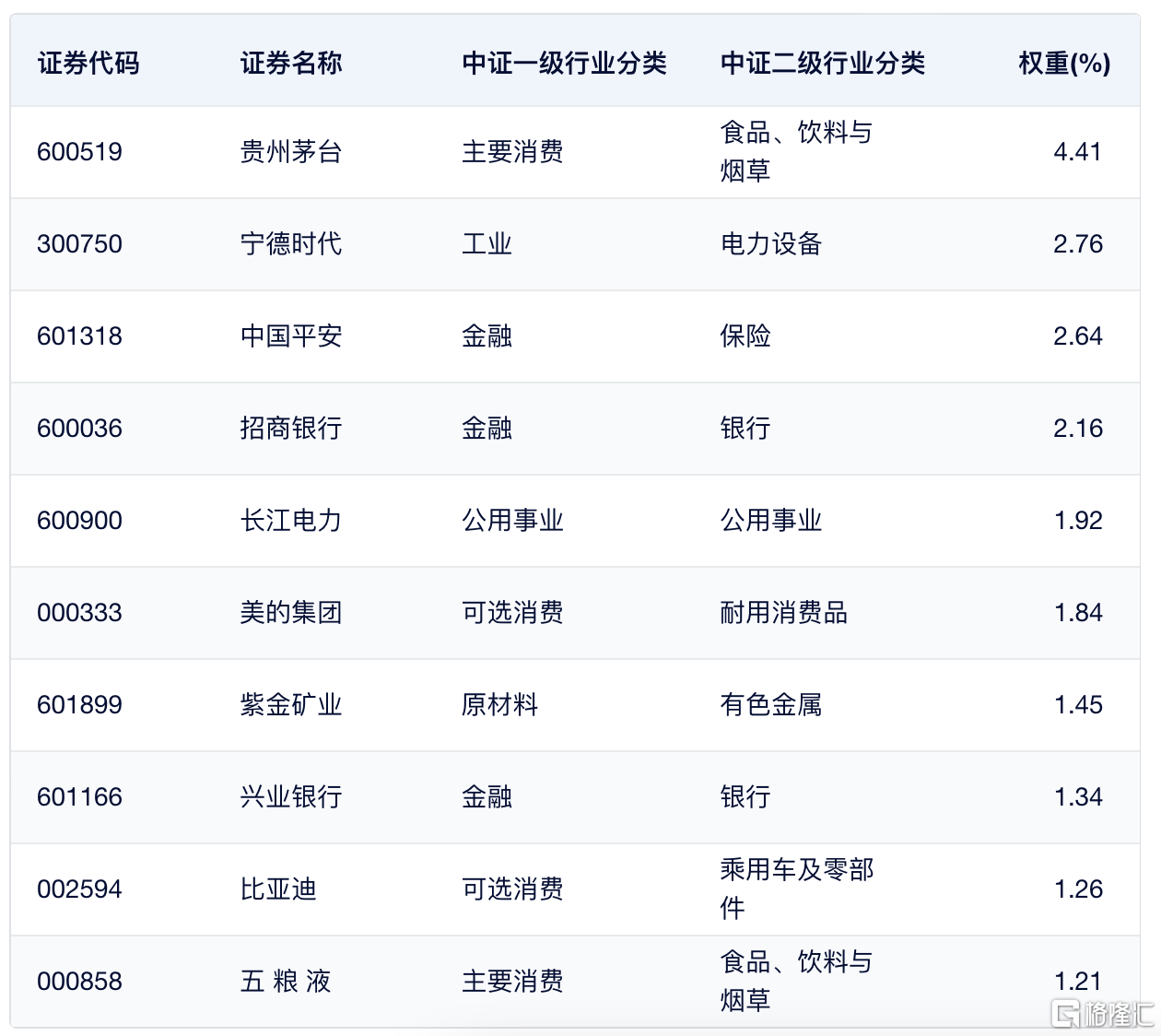 中证A500最大权重股贵州茅台,权重4.43%;其次为宁德时代、中国平安、招商银行,权重均超2%;再者,长江电力、美的集团、紫金矿业、兴业银行、比亚迪、五粮液,权重均超1%。