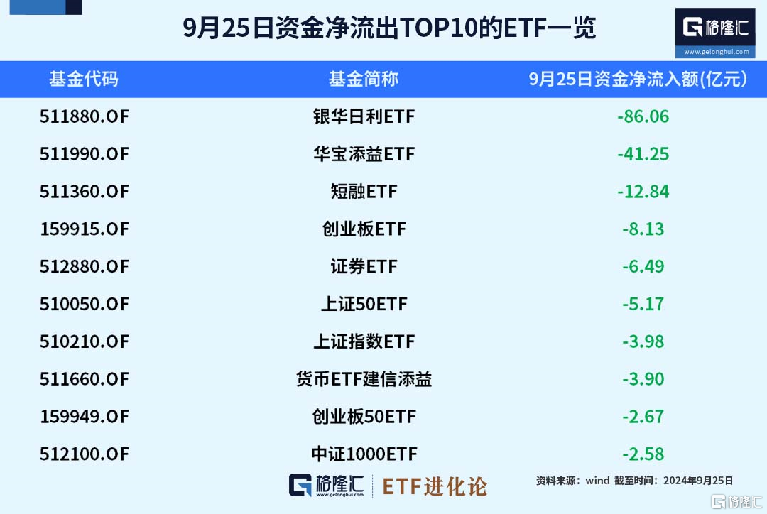 9月25日,ETF资金净流出额TOP10的ETF分别为银华日利ETF、华宝添益ETF、短融ETF、创业板ETF、证券ETF、上证50ETF、上证指数ETF、货币ETF建信添益、创业板50ETF、中证1000ETF,在9月25日分别获得-86.06亿元、-41.25亿元、-12.84亿元、-8.13亿元、-6.49亿元、-5.17亿元、-3.98亿元、-3.90亿元、-2.67亿元、-2.58亿元的资金净流入。