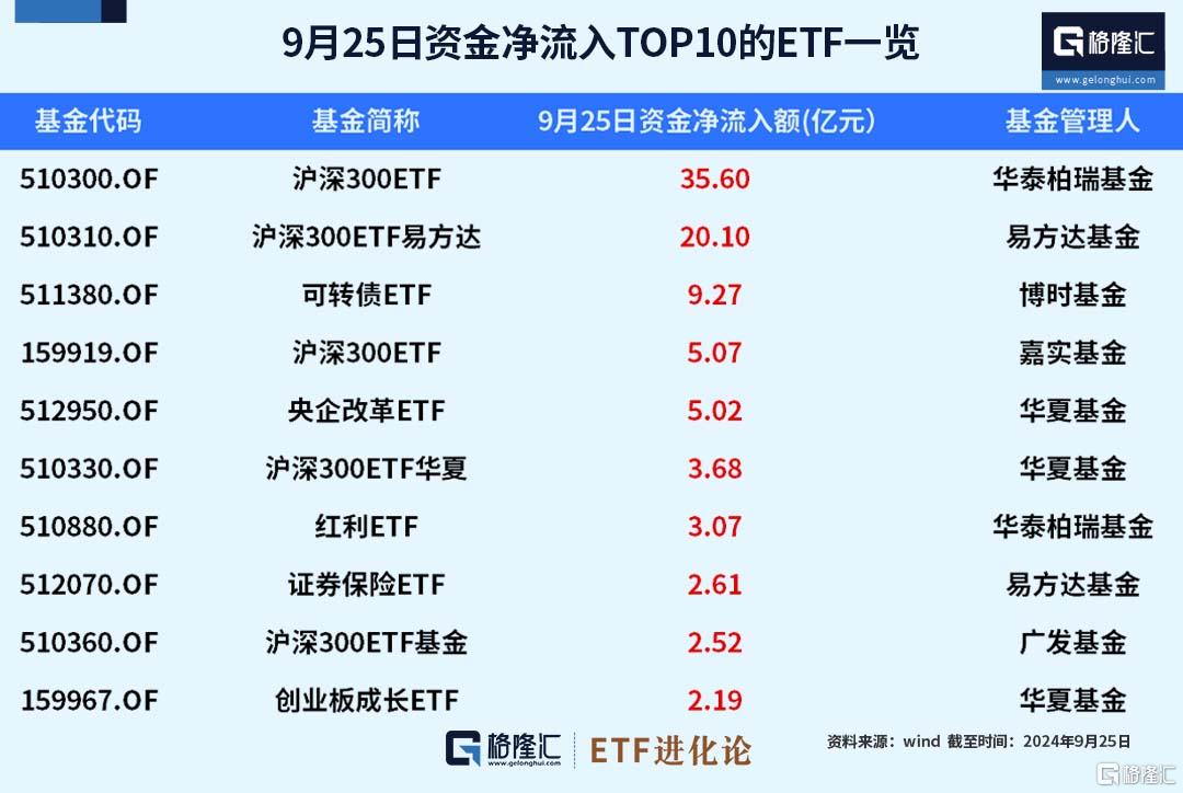从ETF资金流向看,9月25日,资金净流入额TOP10的ETF分别为华泰柏瑞基金沪深300ETF、易方达基金沪深300ETF易方达、博时基金可转债ETF、嘉实基金沪深300ETF、华夏基金央企改革ETF、华夏基金沪深300ETF华夏、华泰柏瑞基金红利ETF、易方达基金证券保险ETF、广发基金沪深300ETF基金、华夏基金创业板成长ETF,在9月25日分别获得35.60亿元、20.10亿元、9.27亿元、5.07亿元、5.02亿元、3.68亿元、3.07亿元、2.61亿元、2.52亿元、2.19亿元的资金净流入。