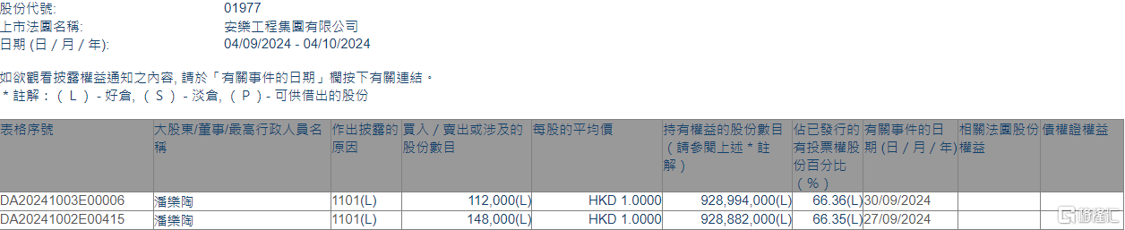 格隆汇10月4日丨根据联交所最新权益披露资料显示,2024年9月27日及9月30日,安乐工程(01977.HK)获执行董事潘乐陶在场内以每股均价1.00港元合计增持26万股,涉资约26万港元。