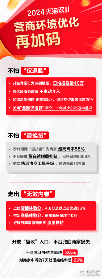 随着淘宝松绑"仅退款"、推出"退货宝"等系列举措上线,商家在此次天猫双11中的营商环境已得到大幅改善。