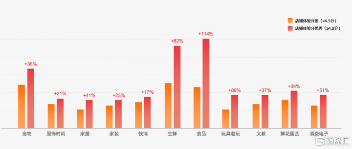更好的服务为淘宝商家带来了用户复购的显著增长,如在食品、生鲜行业,店铺体验分4.8分以上商家的复购率分别提升114%及82%。未来,淘宝还将投入更多权益支持,让服务体验分成为淘内硬通货。