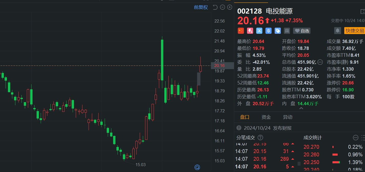 电投能源(002128.SZ)今日跳空高开,现涨超7%报20.16元,成交额放大至7.4亿元,总市值452亿元。公司昨日盘后公告,前三季度实现营业收入218.1亿元,同比增长10.54%;归属于上市公司股东的净利润44亿元,同比增长22.73%。其中,第三季度实现净利润14.55亿元,同比增长45.26%。民生证券点评称,公司Q3盈利同环比大幅提升,新能源成长可期,维持“推荐”评级。(格隆汇)