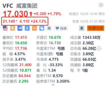 Vans、北面品牌母公司威富集团(VFC.US)夜盘大涨超24%,报21.14美元。消息面上,威富集团公布截至9月底的第二财季业绩,营收同比下降6%至27.6亿美元,超过分析师预期的27.1亿美元;其中,按固定汇率计算,中国市场收入同比增长9%,而去年同期则增长4%。期内录得盈利5217.8万美元,对比去年同期亏损4.5亿美元;调整后每股收益0.6美元,高于分析师预期的0.37美元。指引方面,威富集团预计第三财季营收将在27亿至27.5亿美元之间,市场预期为27.8亿美元。(格隆汇)