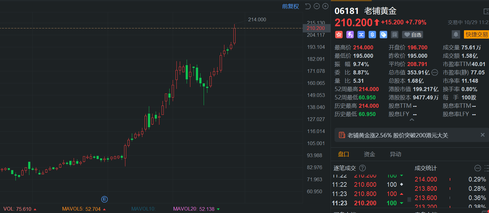 老铺黄金(6181.HK)再度拉升涨超8%,报214港元再度刷新上市新高价,上市以来累计升幅高达420%,总市值255亿港元。消息面上,国际金价屡创新高,国内金店黄金金饰零售价也跟随飞涨。在9月23日,老铺黄金宣布涨价,老铺黄金店员称,古法黄金系列今年以来已经涨价两次,平均涨幅在9%左右。中金认为,老铺黄金在高端黄金珠宝行业中无直接竞争对手、产品彰显美学溢价,且当前门店规模仍小,公司未来的成长性仍有望得到保证。国海证券首予老铺黄金“增持”评级,指其线下门店数量继续扩张贡献业绩收入。(格隆汇)