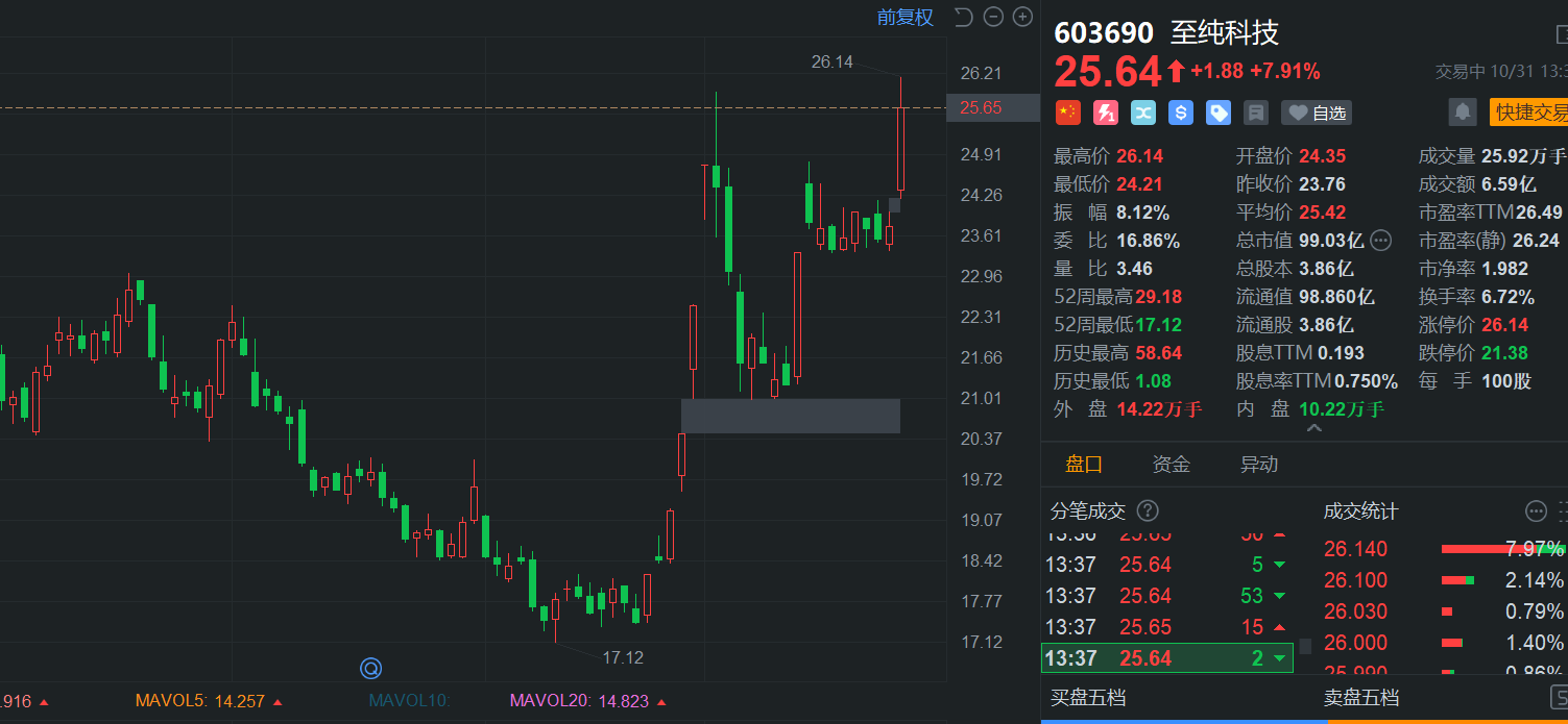 至纯科技(603690.SH)盘中拉升触及涨停,现报26.64元涨7.9%,总市值重回百亿元关口。近日该公司利好消息频发:第三季度净利润1.19亿元,同比增长36.40%;公司投资4500万元设立半导体基金,另外,拟斥资8000万元-1.6亿元回购股份。(格隆汇)