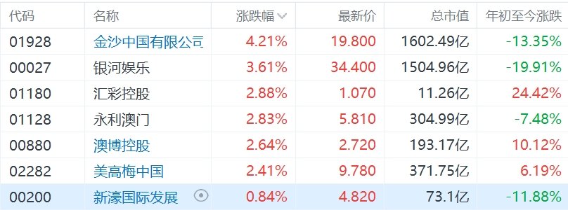 港股市场濠赌股集体走强,金沙中国涨超4%,银河娱乐涨超3%,永利澳门、澳博控股、美高梅中国涨超2%。