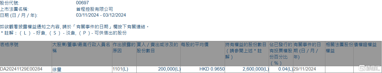 格隆汇12月3日丨根据联交所最新权益披露资料显示,2024年11月29日,首程控股(00697.HK)获执行董事徐量在场内以每股均价0.965港元增持20万股,涉资约19.3万港元。