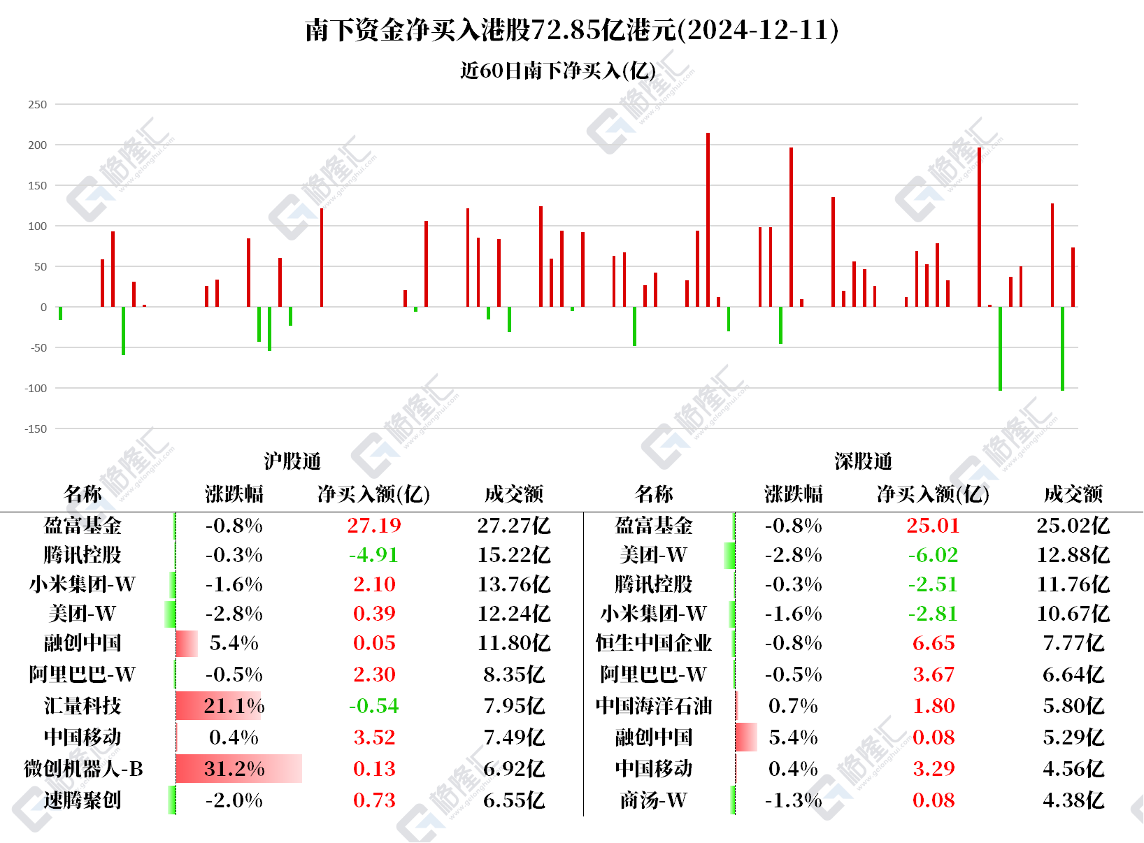 净买入盈富基金52.21亿、中国移动6.8亿、恒生中国企业6.64亿、阿里巴巴5.96亿、中国海洋石油1.79亿;