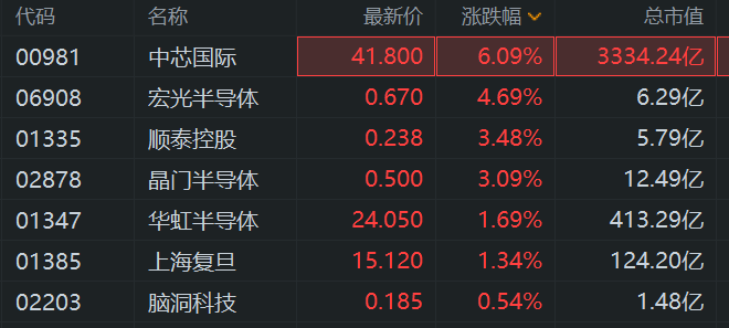港股半导体股持续拉升上扬,其中,龙头中芯国际大涨6%领衔且继续刷新阶段新高,近一个月累计涨幅更是高达50%。宏光半导体涨约5%,晶门半导体涨3%,华虹半导体、上海复旦跟涨。