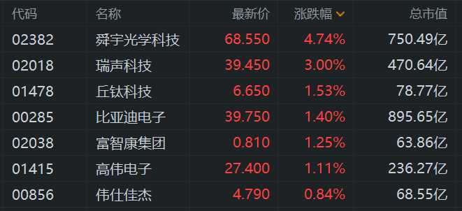 手机产业链股持续活跃,其中,舜宇光学涨近5%,瑞声科技涨3%,丘钛科技、比亚迪电子、高伟电子涨超1%。
