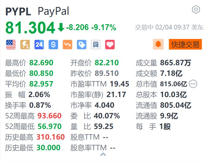 Paypal(PYPL.US)跌9.17%,报81.3美元。消息面上,Paypal Q4净营收同比增长4%至83.7亿美元,市场预估82.7亿美元;调整后每股收益1.19美元,市场预估1.13美元。营业利润率下降431个基点,至17.2%。期内支付交易数量下降3%。(格隆汇)