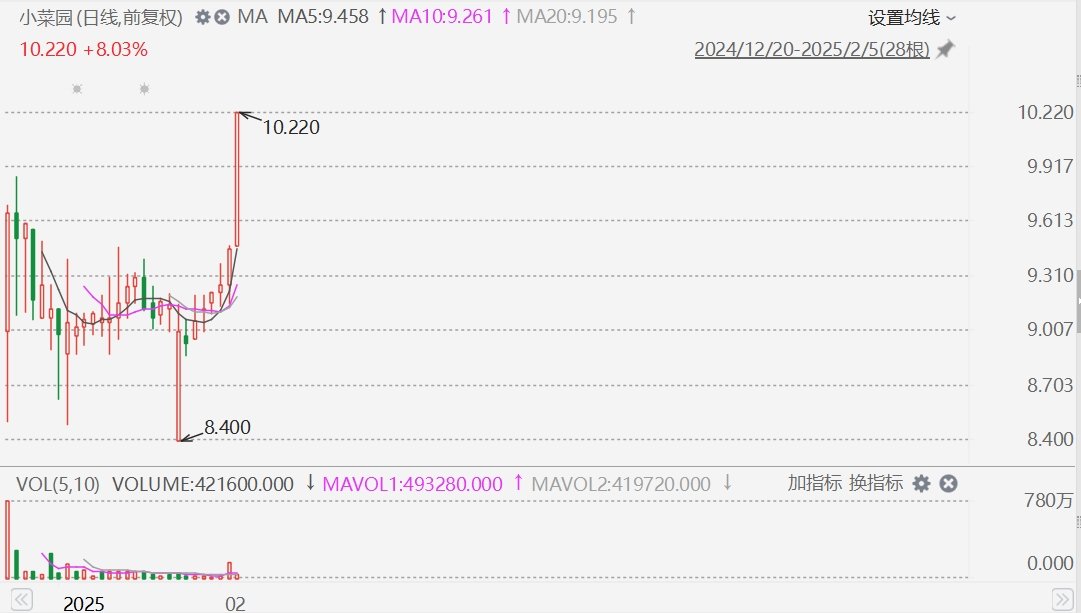小菜园(0999.HK)今日逆势拉升,盘中一度涨8%,报10.22港元,股价创上市新高,市值达120亿港元。