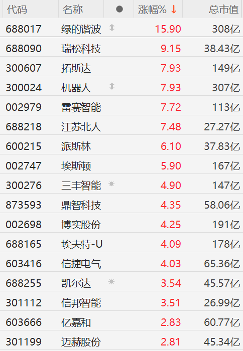 A股市场机器人概念股集体走强,其中,绿的谐波涨近16%,瑞松科技涨超9%,拓斯达、机器人、雷赛智能、江苏北人涨超7%,派斯林涨超6%,埃斯顿涨超5%,三丰智能、鼎智科技、博实股份、埃夫特-U、信捷电气涨超4%,凯尔达、信邦智能涨超3%。