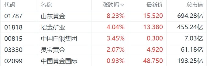 港股黄金股集体强势,截至半日收盘,山东黄金涨超8%,招金矿业涨4%,中国白银集团涨超3%,灵宝黄金涨2%。国际金价在亚洲时段再创历史新高,伦敦金现一度涨至2854.46美元。