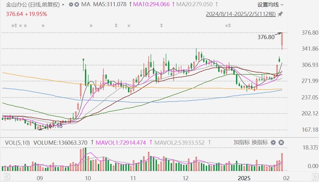 金山办公(688111.SH)午后进一步拉升,触及涨停板,涨停报价376.8元,股价创2023年10月以来新高。国内大模型Deepseek春节假期期间火爆出圈,其在能力、成本、开放性等方面备受瞩目,加快了AI技术进步速度,有望重塑全球AI格局,为国内AI产业的发展前景提供更多可能。值得一提的是,DeepSeek的科技成果给AI垂直向下的端侧和应用带来更大想象力,打破了传统上由少数科技巨头主导AI产业发展的局面,为中国企业提供了更多的发展机会。