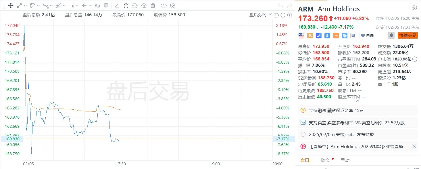 Arm控股美股盘后跌超7%。Arm控股第三财季总体营收9.83亿美元,分析师预期9.468亿美元。第三财季许使用费营收5.80亿美元,分析师预期5.684亿美元。第三财季许可与其他营收4.03亿美元,分析师预期3.786亿美元。第三财季调整后运营利润4.42亿美元,分析师预期3.971亿美元。预计全年调整后EPS为2.56-1.64美元,公司原本预计1.45-1.65美元。预计全年营收39.4亿-40.4亿美元,公司原本预计38.0亿-41.0亿美元。预计第四财季营收118亿-128亿美元,分析师预期123亿美元。