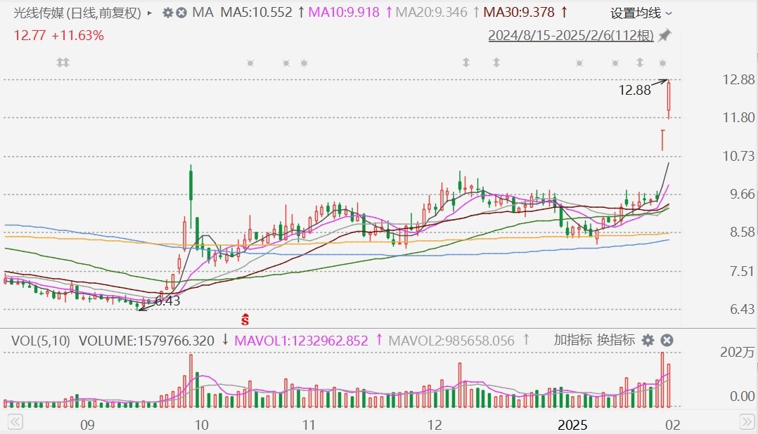 继昨日20CM涨停后,光线传媒(300251.SZ)今日盘初再度拉升大涨超12%,报12.88元,股价创2021年3月以来新高。据灯塔专业版最新数据显示,国漫IP哪吒系列第二部《哪吒之魔童闹海》总票房(含点映及预售)已突破57亿元,成为春节档票房总冠军。光线传媒昨晚发布公告称,公司及子公司出品、发行的影片《哪吒之魔童闹海》自2025年1月29日上映以来,截至2月4日,累计票房收入约为人民币48.40亿元,超过公司最近一个会计年度经审计的合并财务报表营业收入的50%。公司来源于该影片的营业收入区间约为人民币9.50亿元至10.10亿元。(格隆汇)