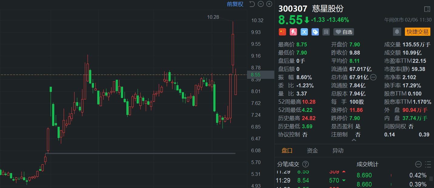 慈星股份(300307.SZ)午间大幅收跌13.46%,报8.55元,总市值67.9亿元。消息上,公司昨日晚间披露公告称,决定终止发行股份及支付现金购买武汉敏声新技术有限公司控股权并募集配套资金事项,并于今日开市起复牌。实际上,慈星股份此次并购筹划时间并不长。值得一提的是,停牌前,慈星股份股价出现提前大涨的情况。(格隆汇)