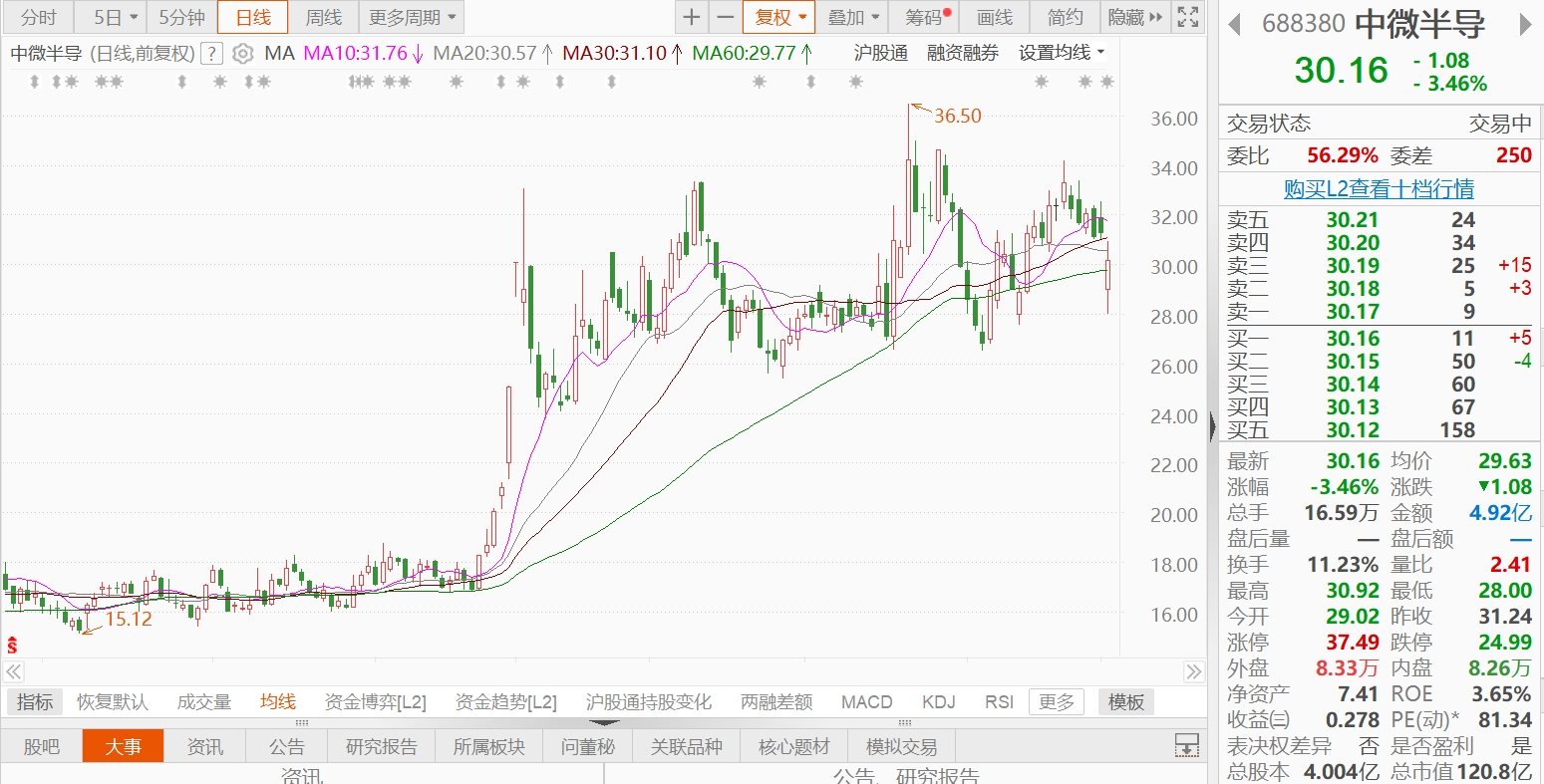 中微半导(688380.SH)早盘一度跌逾10%,现跌3.46%报30.16元,总市值120.8亿元。中微半导(688380)公告称,公司董事罗勇和监事蒋智勇因个人资金需求,计划自公告披露之日起15个交易日后的3个月内通过集中竞价、大宗交易方式减持其所持有的公司股份。其中,罗勇计划减持不超过388.35万股,占公司股份比例不超过0.97%;蒋智勇计划减持不超过405万股,占公司股份比例不超过1.01%。